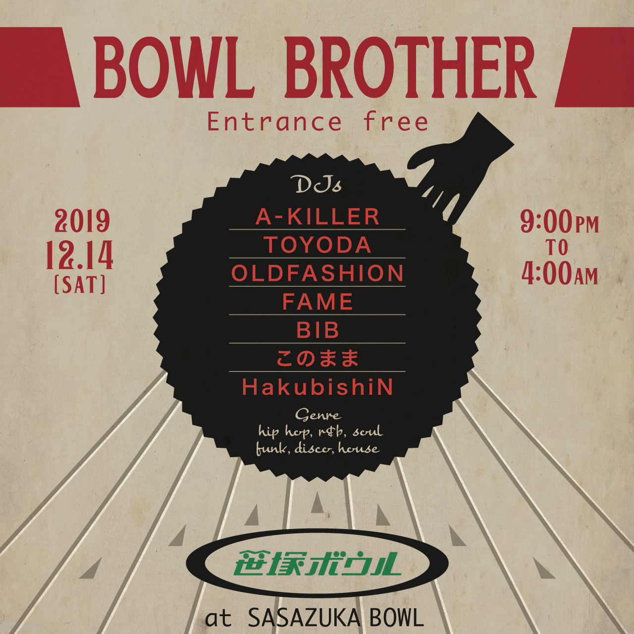 BOWL BROTHER Posted on 2020-02-182020-03-20 FLYER FLYER DESIGN View this post on Instagram 今週末は、DJが奏でる良質な音楽をレストランフロアより、お楽しみください! #Repost @andres_coco_cotoco_ with @get_repost ・・・ 🎳DJ in bowling alley🎳 (SAT) / 21st / Sep 🎱ENTRANCE FREE!!! This Saturday night 9:00pm-START! Join us & Let's play together! Please bring your friends😆🍺 初めてボーリング場でDJする事になりました🎱❤️入場無料です! 皆でボーリングしましょう〜! Thanks so much for having me @wadashin514 @konomama1990 !! I'm so excited to be there,This is my first time for DJing in bowling alley ever🎱❤️ ・ 【DJ】 A-KILLER OLDFASHION COTOCO Okuyama このまま HakubishiN ・ 【VENUE】 @sasazukabowl Free Entry SASAZUKA BOWL 1 Chome-57-10 Sasazuka, Shibuya, Tokyo 151-0073 #笹塚ボウル #sasazukabowl #szbl #bowlingparty #bowlingalley #hiphopparty A post shared by 笹塚ボウル (@sasazukabowl) on Sep 16, 2019 at 9:42pm PDT